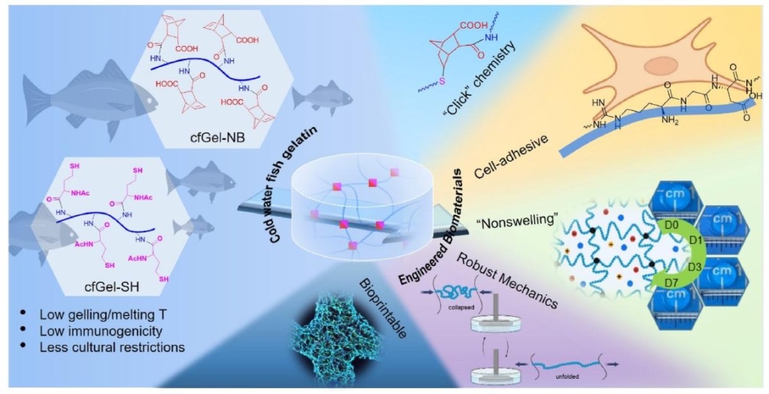 ,联合多方开展深入研究,致力于突破这一困境。他们以冷水鱼明胶(cfGel)为原料,借助硫醇-烯“点击”化学构建了仅含单一网络的新型非溶胀水凝胶