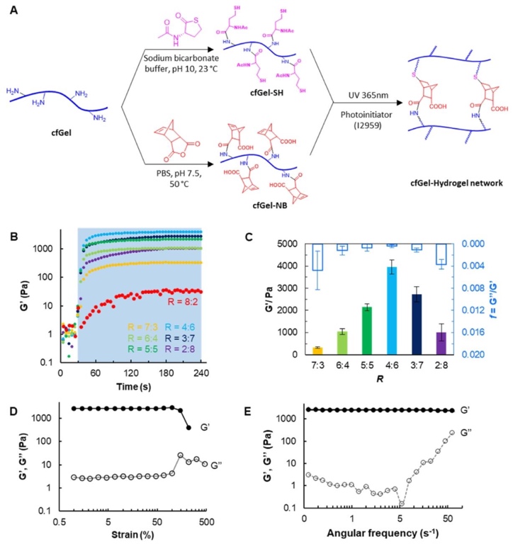 水凝胶合成与流变特性,通过合成cfGel-NB和cfGel-SH功能聚合物,利用硫醇-烯“点击”化学交联,结合流变学测试(时间扫描、应变扫描、频率扫描),研究了不同cfGel-NB与cfGel-SH质量比(R)对水凝胶交联效率、刚度(G')和线性粘弹性范围的影响。结果表明,UV曝光10秒内可快速成胶,R=4:6时G'最高,水凝胶可承受100%应变未断裂,呈现低阻尼特性。