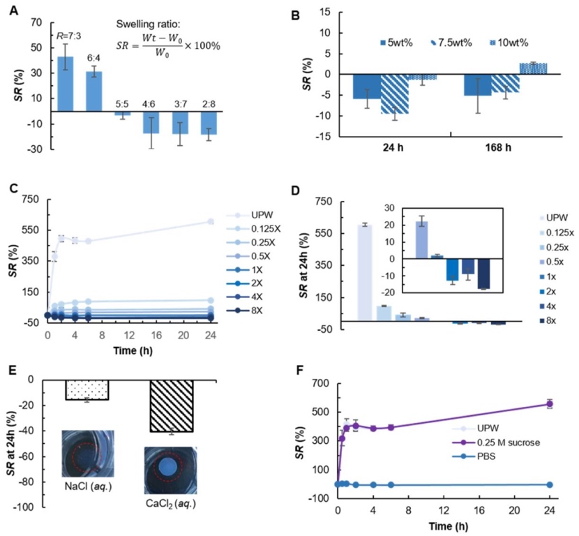 生理条件下的非溶胀特性,通过在不同浓度PBS、超纯水(UPW)、NaCl和CaCl₂溶液中测量溶胀率(SR),研究了cfGel-水凝胶的溶胀行为与离子强度的关系。结果表明,R=5:5的水凝胶在PBS中溶胀率<±10%,表现为非溶胀;高盐溶液(如8×PBS)导致脱水收缩,而低离子强度溶液(如UPW)引发显著肿胀,Ca²⁺通过与明胶羧酸基团相互作用增强脱水收缩。