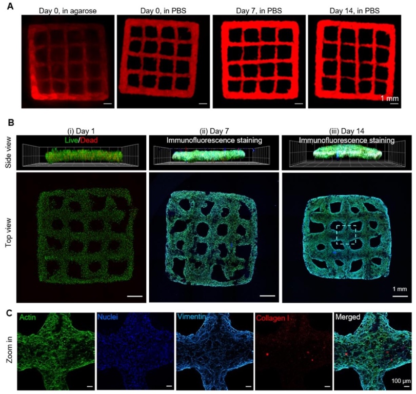 wt%因刚度较高限制细胞扩散;结合FRESH技术打印含细胞的多层网格结构,证明水凝胶在2周培养中保持形状保真度,仅因细胞收缩力出现轻微弯曲。