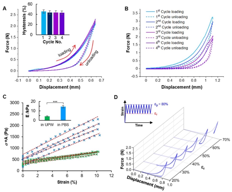 机械性能与分子机制,通过循环压缩测试、杨氏模量测量和橡胶弹性理论计算,研究了水凝胶在PBS和UPW中的力学响应及分子链构象变化。结果表明,PBS中受限溶胀使水凝胶具备高机械稳健性(承受80%压缩应变,滞后率>40%),而UPW中溶胀导致力学性能下降;分子链在PBS中的构象收缩率达49%,交联点间距缩短,解释了能量耗散与快速恢复特性。