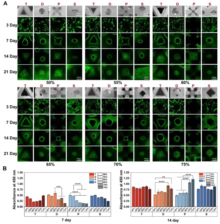 Chip对BMSCs行为的影响。结果表明,60%-70%孔隙率的菱形和多面体结构细胞增殖较好,14天培养时方形结构的成骨基因(如Runx-2、ALP)表达显著升高。