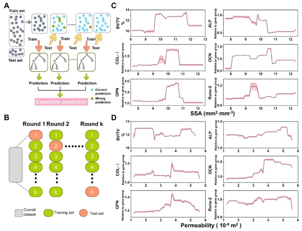 结构参数与骨诱导性的相关性分析及机器学习建模,通过Pearson相关系数(PCC)和XGBoost模型,分析了孔隙率、SSA、渗透率等参数与骨诱导性(BV/TV、成骨基因表达)的线性及非线性关系。结果表明,SSA与BV/TV呈先升后降的非线性关系,最优SSA为10.49-10.69