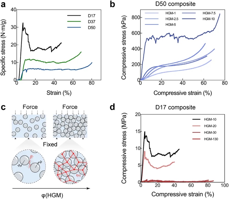 首先通过单轴压缩测试研究了HGM尺寸对复合材料力学性能的影响,发现较小尺寸的HGMs(D17)表现出更高的比强度和更明显的坍塌行为,而较大尺寸的HGMs(D37和D50)则因内壁应力降低而表现出较低的坍塌抗力。此外,随着HGMs/PAA比例的增加,复合材料的应力传递机制从PAA界面滑动转变为HGMs力链网络(图3)。