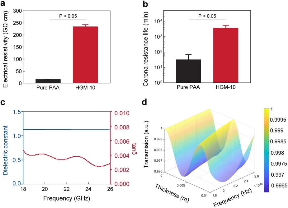在电气性能方面,研究发现高HGM含量显著提高了材料的体积电阻率,延长了电晕寿命,并在K波段(18-26 GHz)表现出优异的波透明性能(图4)。