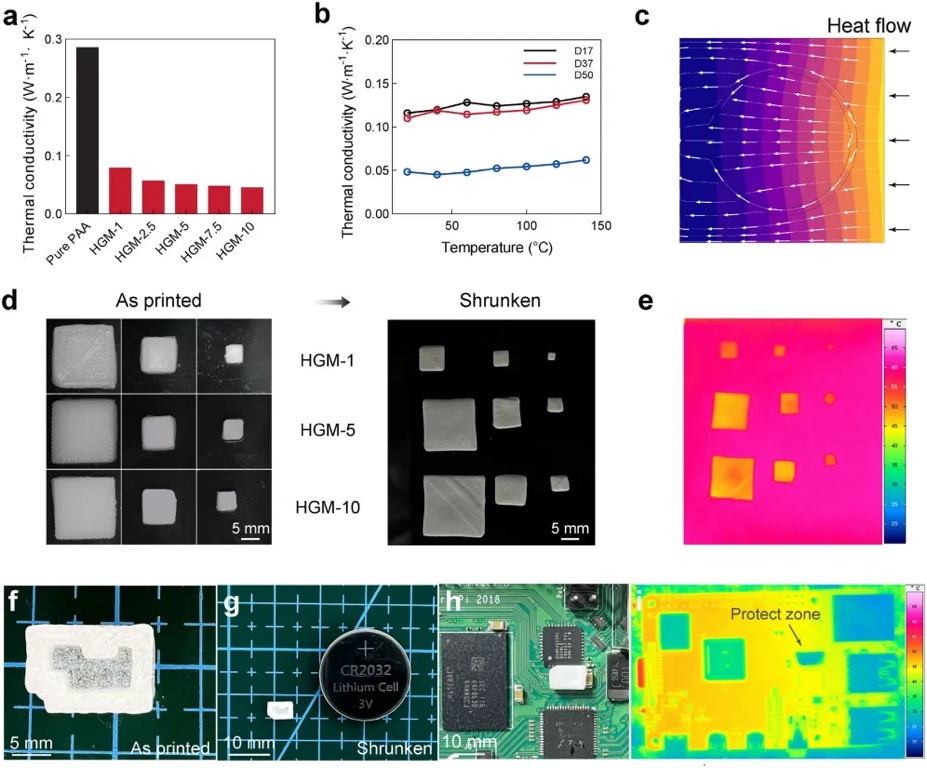 K⁻¹(图5a)。通过有限元方法(FEM)模拟热流路径,发现热量倾向于沿着HGMs的壁面传导,从而增加了热阻(图5c)。作者还展示了如何利用HGM-1复合材料制造微电路板上的局部热屏蔽,通过控制干燥过程实现尺寸缩小,从而提高打印分辨率,并成功应用于微电路的热保护(图5d-i)。