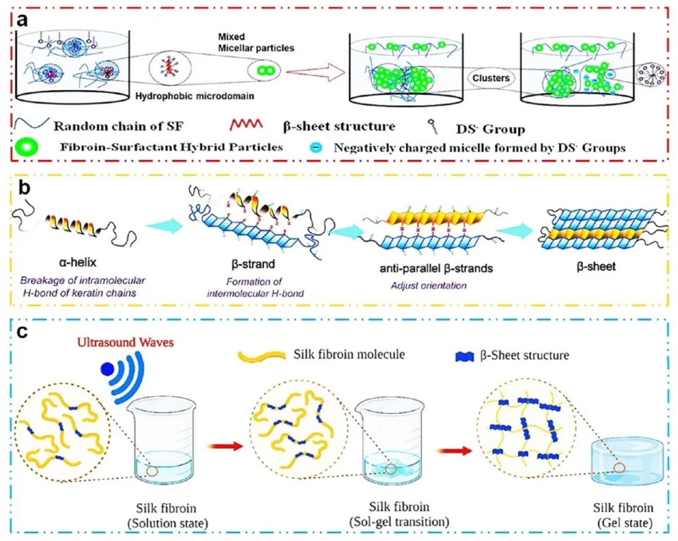 图3. 丝素蛋白水凝胶通过分子组装和结晶过程的形成示意图。