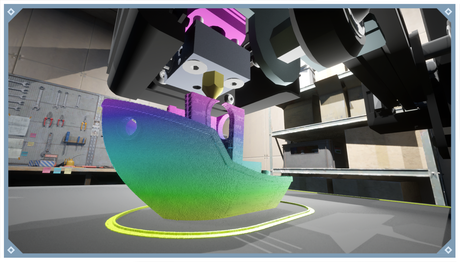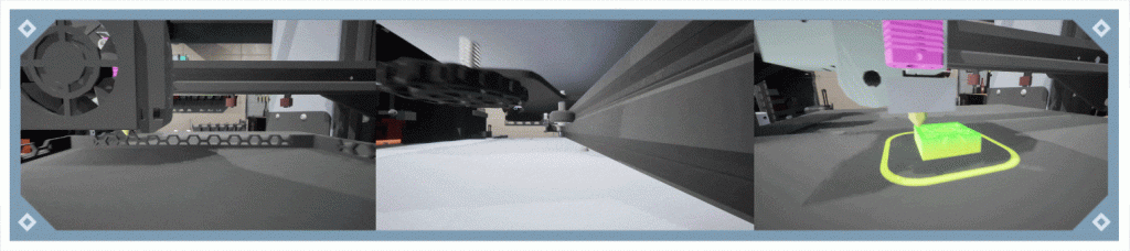 代码或在应用程序中生成切片。自由移动的摄像头和可调节的照明有助于可视化各个打印层,而喷嘴的透明度开关则可提供更高的清晰度。环境设置在逼真的仓库式工作空间中,以模拟真实的车间环境。