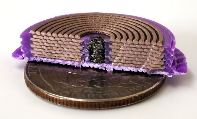 △麻省理工学院的研究人员改进了一台多材料3D打印机,能够层叠三种不同材料的超薄线圈,一步制作出三维螺线管。