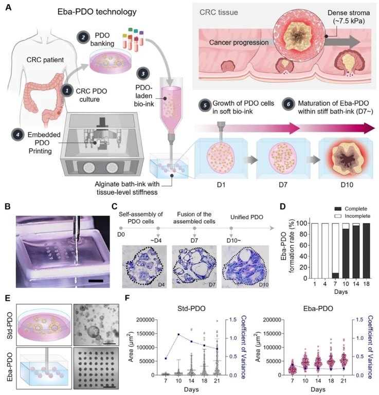 Myung教授团队合作,开发了嵌入式生物打印技术构建类器官阵列(Eba-PDOs)。该技术通过将PDO油墨精确打印到模拟肿瘤硬度(≈7.5
