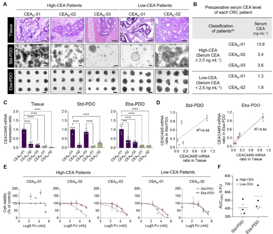 类器官阵列的患者异质性与药物响应验证,通过培养5例患者的Eba-PDOs并进行5-氟尿嘧啶(5-FU)药物测试,分析CEACAM5水平与化疗敏感性的关联。结果表明,Eba-PDOs的CEACAM5表达与患者血清水平高度相关(r=0.84),高CEA组对5-FU的耐药性显著更强(AUC差异>20%),而Std-PDOs未能区分该差异,验证了Eba-PDOs在预测个体药物响应中的价值。