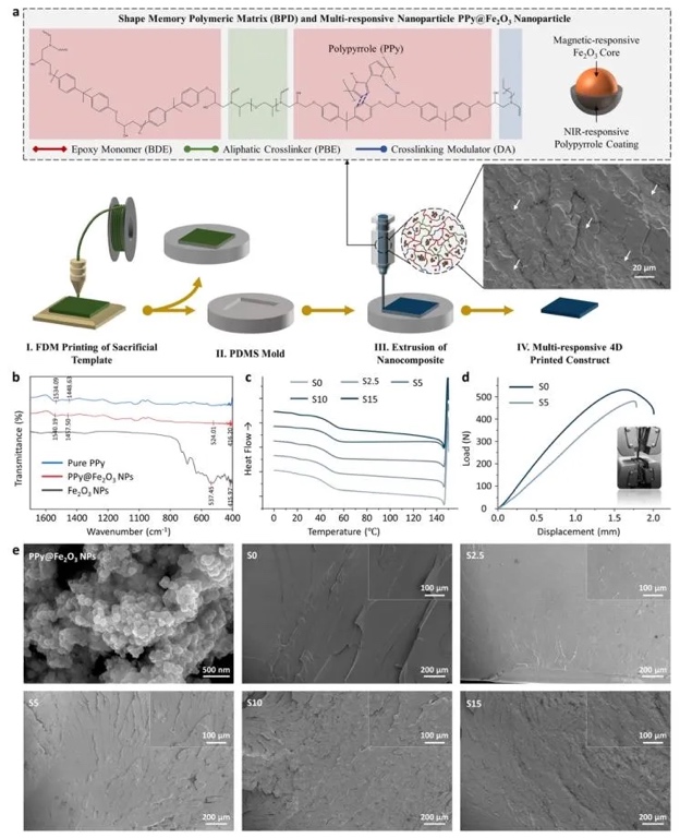 本研究成功设计了一种创新的多响应4D纳米复合材料,通过将合成的纳米颗粒掺杂到形状记忆聚合物基质中,使其展现出优异的光响应和磁响应特性。与其他4D打印材料相比,该纳米复合材料可通过近红外激活实现精准、动态且可远程控制的时空变形,并能通过磁力推进在三维空间中移动。此外,本研究开发了一种概念验证性4D打印半管状结构,为制备满足结构和功能需求的动态组织构建体提供了有效方法。利用该纳米复合材料,研究人员设计并制造了三款用于不同目的的概念验证智能机器人。这些智能机器人除了具备基本的货物抓取能力外,还能够将不同货物提升并递送至指定位置,并在受限环境中进行三维空间导航。重要的是,所有这些复杂操作均通过近红外光照和外部磁场远程控制实现,凸显了该纳米复合材料在细胞或药物递送、组织修复或疾病治疗等各种应用中的潜力。