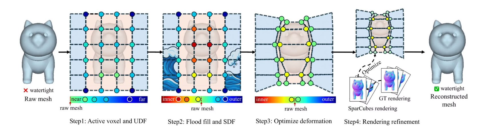通过在稀疏立方体网格上散射有符号距离场和变形场,将原始网格数据转换为高分辨率 1024³