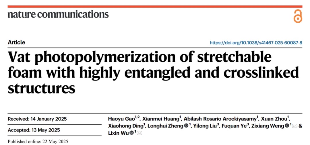 相关工作以“Vat photopolymerization of stretchable foam with highly entangled