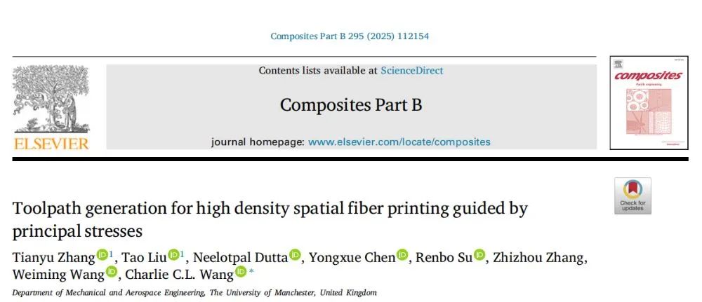 CFRTP)增材制造的研究成果。该研究提出了一种基于主应力引导的高密度纤维路径生成方法,通过优化方向场和周期性标量场生成等距纤维路径,有效克服了现有方法在纤维覆盖密度和方向一致性上的局限性。论文标题为“Toolpath