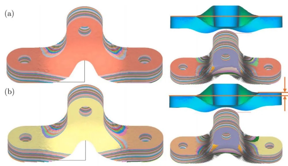 Squares算法提取其等值线作为纤维路径。这一创新使得生成的路径不仅严格遵循主应力方向,还能保持近乎相等的间距,从而实现了高达87.5%的纤维覆盖率。为适应复杂几何形状,研究还扩展了基于四元数的S³-Slicer曲面切片算法,通过局部旋转优化和全局变形控制生成曲层,并特别设计了高度一致性约束来优化孔洞周围的纤维缠绕。
