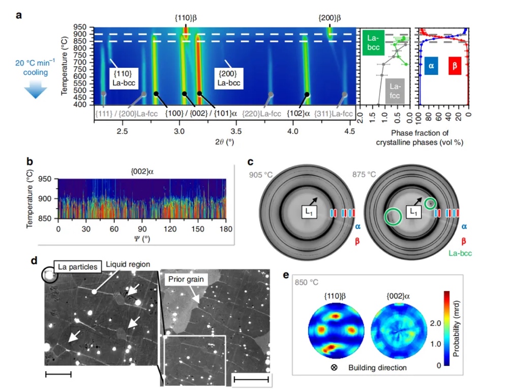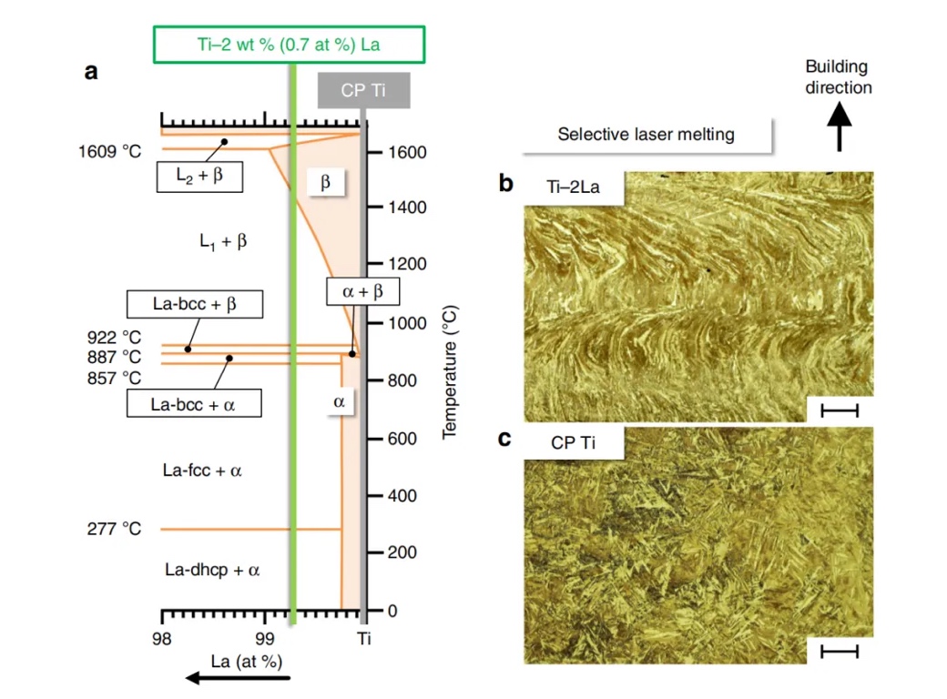 La成分的方法通过改变常规β→α相变路径,探索钛合金中α相形成的非典型路径。a:Ti-La相图的局部(基于29,50改编),指示用于选择性激光熔化的成分。b,