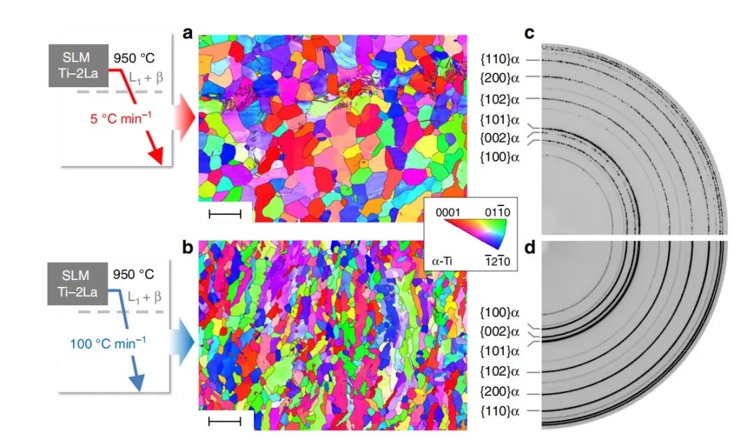 La(Ti-2La)合金在选择性激光熔化(SLM)后的晶粒细化。a,b:通过分别以5°C min⁻¹和100°C