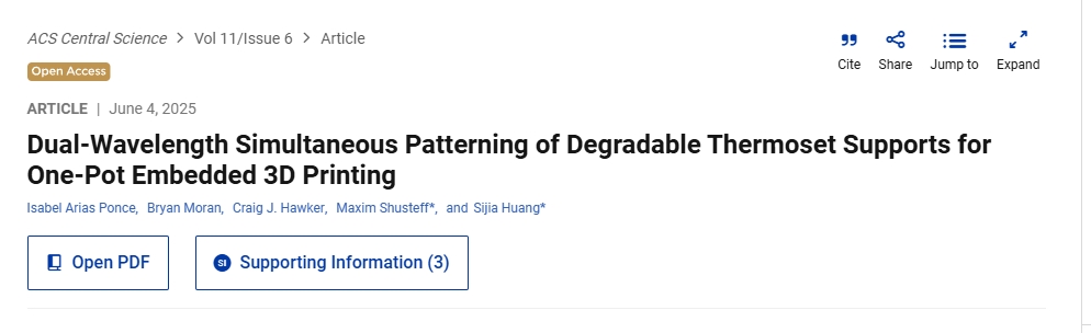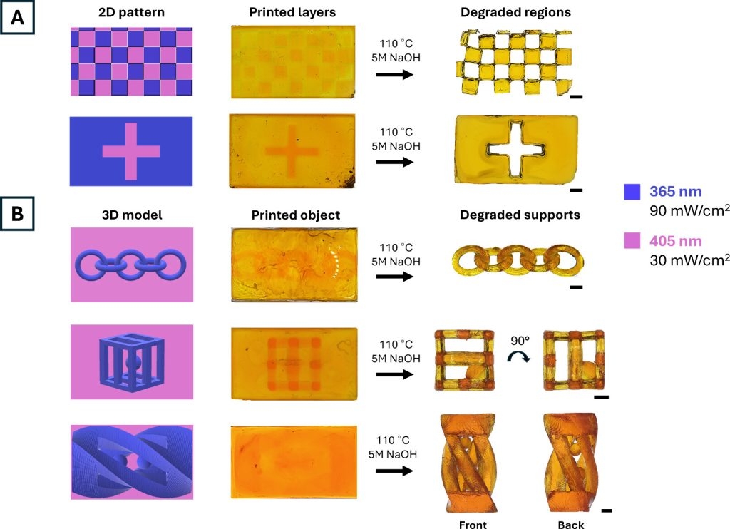 打印的双波长树脂系统。这项研究展示了一种创新的“一锅法”树脂配方,它能够同时打印出永久性结构和可降解支撑。这项技术的优势在于无需更换树脂或进行手动支撑移除,这大大简化了打印过程。