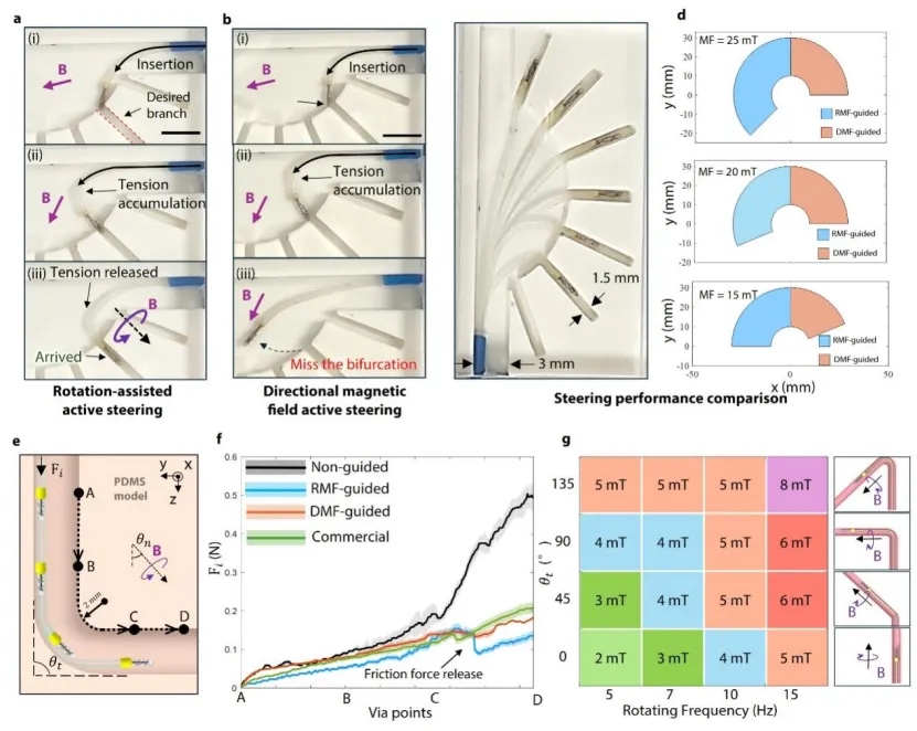 在导航实验中,利用机器人臂控制的五自由度磁体系统产生定向和旋转磁场,实现微导管头部的精准定位和方向控制。实验设置包括人脑血管硅胶仿真模型,涵盖多处狭窄且角度尖锐的分支,通过旋转辅助导航策略减少导管尖端与血管壁的摩擦阻力,有效防止导管体的弯曲和卡阻。结果显示,旋转辅助方法使导管在多重急转弯的血管模型中通行更加顺畅,导航效率较传统静态磁场引导提升约50%,且插入力显著降低,验证了微导管设计在实际应用中高效且安全的导航性能。此外,旋转运动还能促进流体在导管工作腔的输送,增强药物输送效能(图2)。