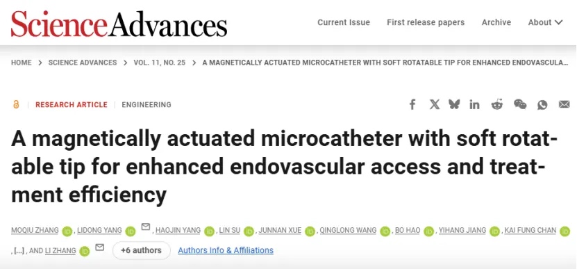 Advances》期刊上在线发表题为“A magnetically actuated microcatheter with soft