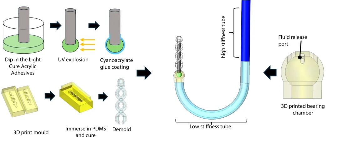 S130,精度:2μm)制备负模,随后用非磁性夹具固定负模,注入预制的PDMS液体,并在负模内嵌入微型永磁体,固化3小时。脱模后获得软性螺旋形导管尖端,球形关节腔及中空关节采用摩方微纳3D打印技术制备,最终通过手动组装,完成可旋转的软性微导管尖端。