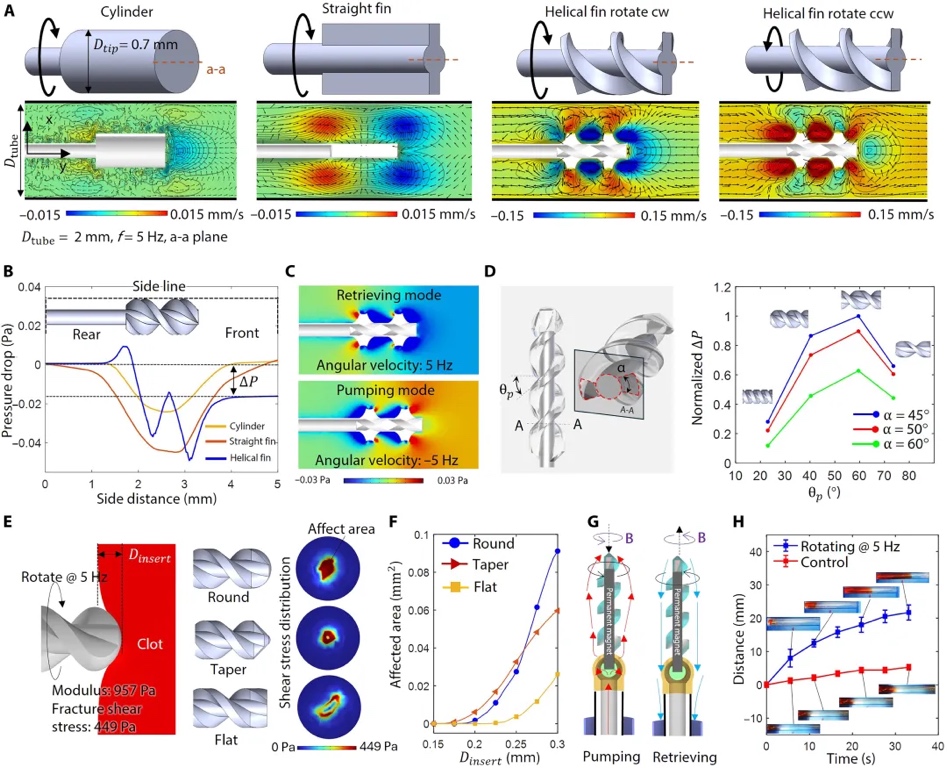 该研究开发的磁控软旋转微导管(MSRM)具备多项创新医疗功能,显著提升血管内介入治疗的效率和安全性。首先,微导管通过旋转辅助主动转向,实现对狭窄、复杂、曲折血管的高效导航,减少导管尖端与血管壁的摩擦,避免弯曲和卡阻,保障在直径小于2毫米的远端血管中的优异通达能力。其次,该导管集成了多种治疗功能,包括药物输送、机械血栓破碎和血栓碎片回收。导管头部的旋转螺旋结构不仅能够促进药物与血栓的高效接触,加快溶栓速度,还能通过机械摩擦作用物理破坏血栓,提高溶栓治疗的总体效果。此外,旋转运动产生的流体动力能够逆向输送血栓碎片,配合吸引装置实现血栓碎片的安全回收,降低血管堵塞和远端栓塞风险。这种药物-机械联合治疗策略有效克服了单纯药物溶栓或机械治疗的局限。最后,导管柔软的旋转头部设计和温和的操作模式降低了血管损伤风险,符合临床对微创、安全性的需求。动物体内及人体血管模型中的实验证明了MSRM在血栓清除和远端血管访问上的高效性和安全性,有望为卒中及其他血管疾病提供更加精准、快速且低创伤的介入治疗手段(图3)。