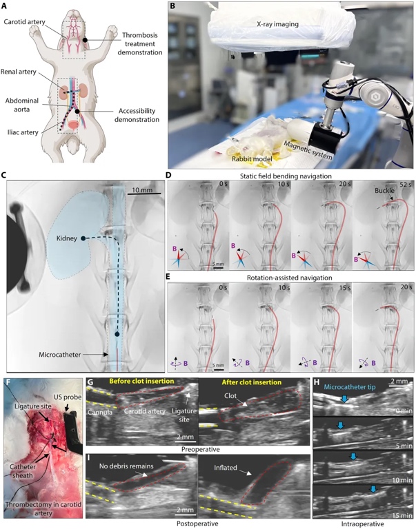 在新西兰兔体内实验中,MSRM微导管成功实现了对复杂血管分支的高效导航,旋转辅助主动弯曲策略使导航速度提升约50%,显著降低了导管张力和卡阻风险。结合局部注射溶栓药物,微导管通过机械旋转辅助快速分解和清除血栓,血栓在15分钟内显著消除,且未观察到血管损伤或并发症。实验结果表明,MSRM具备优异的操作性能和良好的生物相容性,体现了其在微血管导航及血栓治疗中的高效性和安全性(图4)。