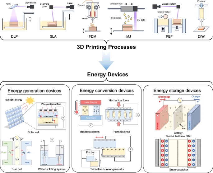 传统能源设备通常受到减材制造工艺的限制,包括材料兼容性受限和几何复杂性受限。研究表明,3D打印能够实现复杂的结构控制、快速成型以及微米和纳米尺度的可扩展制造,从而突破了这些限制。事实证明,这些能力对于开发高性能、特定应用的能源解决方案至关重要。