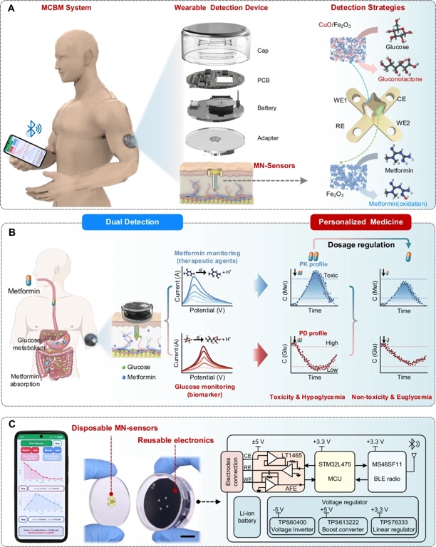 针对传统血液监测方式在实时性与便捷性上的不足,研究团队构建了一套集“传感+分析+反馈”于一体的可穿戴连续监测系统(MCBM),实现对皮肤间质液中葡萄糖与二甲双胍浓度的同步检测。系统由3D打印制备的双传感微针、紧凑型可穿戴电子模块以及手机App组成,可无创附着于皮肤表面,连续采集药物与生物标志物数据。微针中集成了两种高性能纳米酶传感器:其中葡萄糖传感器采用Fe₂O₃/CuO复合材料,具备宽动态范围和高选择性;二甲双胍传感器则以Fe₂O₃为主,确保高灵敏度和特异性。数据通过微控制器、多通道电位仪和低功耗蓝牙模块实时传输至手机端进行分析展示。通过监测药代动力学(PK)参数如AUC和Rmax,系统可实时反馈患者体内的药物吸收水平,辅助医生优化个体化用药剂量,降低低血糖和肝肾酸中毒等风险。MCBM系统不仅实现了“葡萄糖-治疗药物”双指标联动监测,也为居家糖尿病管理提供了智能化、精细化的新路径(图1)。