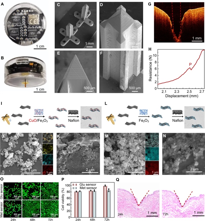 为了实现微创、精准、可靠的连续监测功能,本研究基于摩方微纳3D打印技术,构建了一款集成式微针传感系统(MCBM)。该设备整体尺寸仅为直径40