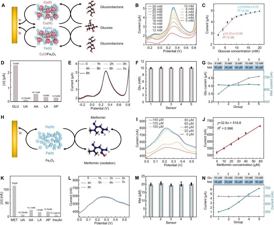 为了验证MCBM系统中微针双传感器的性能,研究团队对葡萄糖和二甲双胍传感器分别进行了体外电化学评估。通过优化纳米酶材料的浓度和比例,显著提升了两者的灵敏度和选择性。葡萄糖传感器基于Fe₂O₃/CuO复合材料,展现出0–28