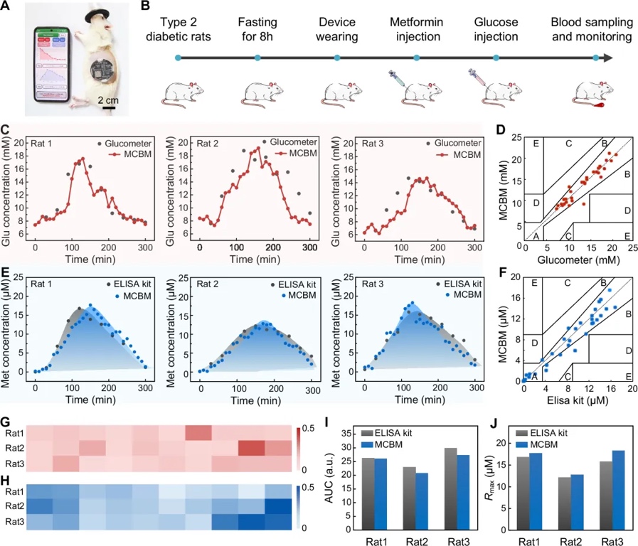 进一步在糖尿病大鼠模型中开展体内实验,MCBM系统成功实现了对葡萄糖与二甲双胍的动态联合监测,数据与标准血糖仪和ELISA试剂盒高度吻合。Clarke误差网格分析显示,93.3%的葡萄糖监测数据落于临床可接受区间A,药物浓度曲线趋势亦与ELISA检测一致,体现了系统在体内复杂环境下的准确性与稳定性。此外,系统还能清晰分辨个体间药物吸收差异,助力构建个性化药代模型。MCBM以其非侵入、实时、双指标联动监测的优势,展示出向临床智能化个体化用药方向应用的巨大潜力(图4)。