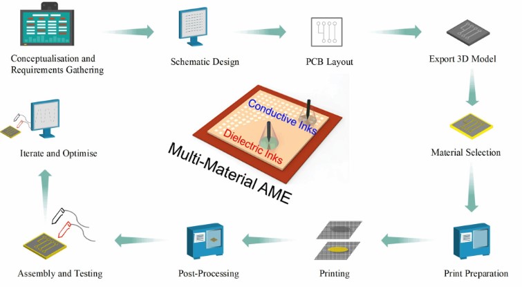 在21世纪,利用3D和4D打印技术的增材制造正在发展成为一门跨学科技术,材料科学、自动化以及电气和电子工程领域的科学家和工程师们为此做出了贡献。如今,增材制造电子产品(AME) 能够实现复杂的电子元件设计,并具有快速原型设计、低入门成本和内部小批量生产等显著优势。这些特性使 AME 成为各种组织(包括初创公司以及其他对保密性和加速创新要求极高的公司)的技术和商业突破。
