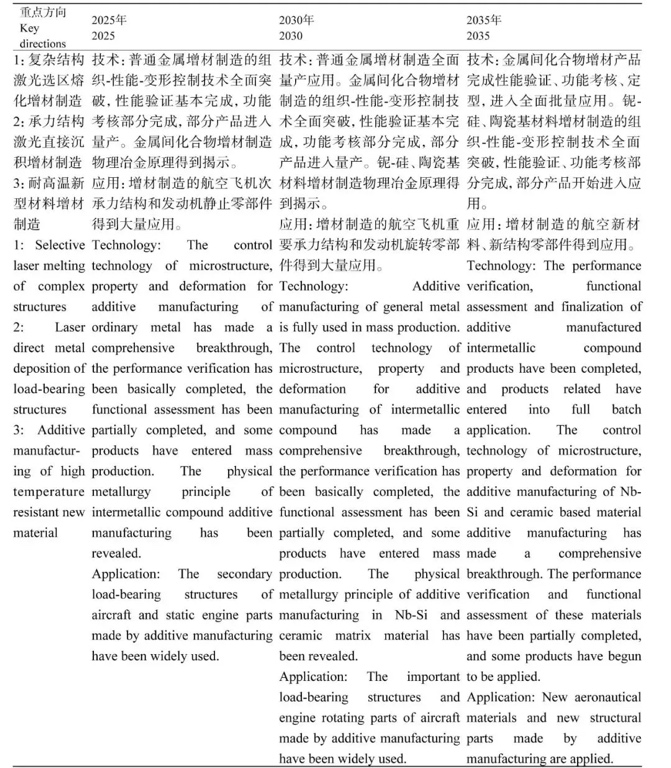 突破飞机、发动机材料激光增材制造缺陷、组织、力学性能控制关键技术,掌握粉末设计与制备技术,制定材料、工艺、检测标准,建立工艺、性能数据库和冶金图谱,掌握零件产品质量控制技术,制定零件产品技术标准。在产品增材制造质量控制技术、产品技术标准研究和零件充分考核验证的基础上,推进激光增材制造在航空、航天、船舶、核工业等重点制造领域的应用。至2035年,在航空领域普通金属激光增材制造全面量产应用;金属间化合物增材制造的组织-性能-变形控制技术全面突破,性能验证基本完成,功能考核部分完成,部分产品进入量产。铌-硅、陶瓷基材料增材制造物理冶金原理得到揭示,性能验证基本完成,部分产品开始装机应用。