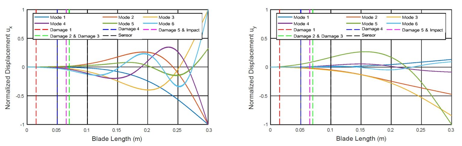 △归一化振型突出显示了多种损伤场景以及传感器和撞击位置。图片来自格罗宁根大学。