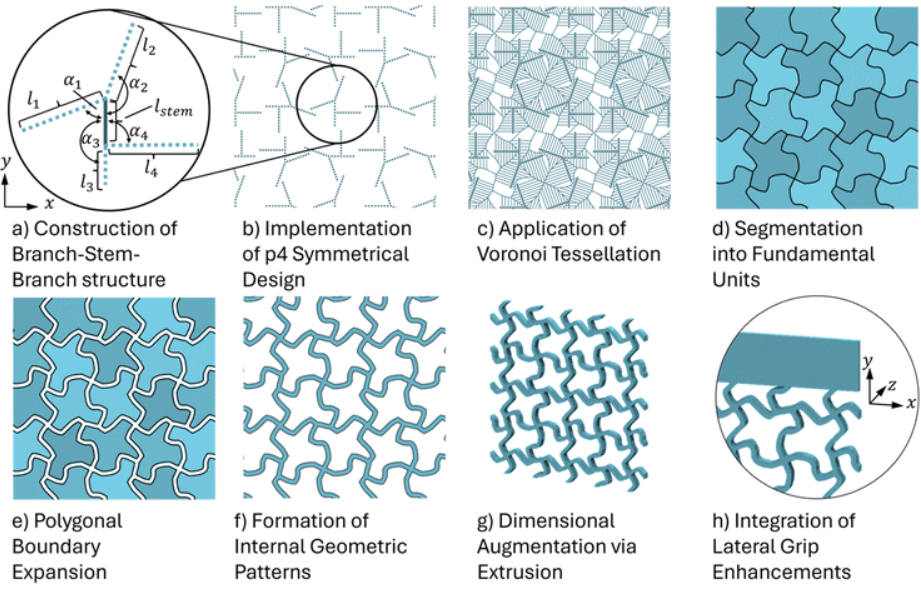 在本研究中,团队采用几何建模方法,基于Voronoi图案和对称运算设计了复杂的晶格结构。这些结构包括拉胀结构,与传统材料不同,这种结构在拉伸时会横向膨胀。这种行为提高了能量吸收和抗损伤能力。一些设计的泊松比低至-0.63,证实具有强大的拉胀性能。