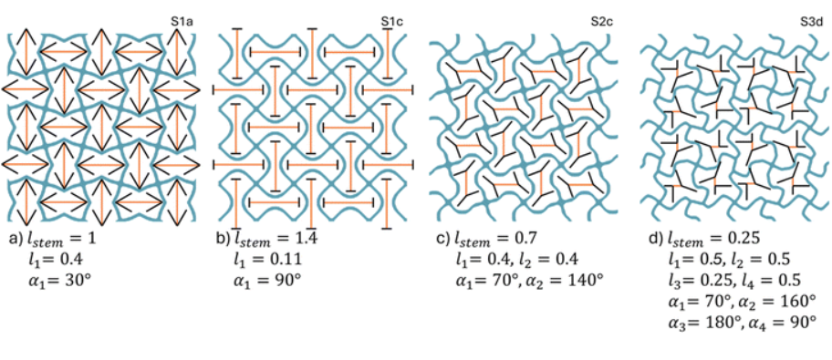 △生成相对密度ρ= 25%的二维拉胀结构的顺序设计和转化过程。图片来自格拉斯哥大学。