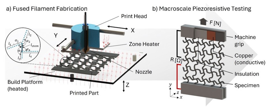 △ (a) FFF 增材制造工艺示意图和 (b) 宏观压阻测试示意图。左图展示了一套 FFF