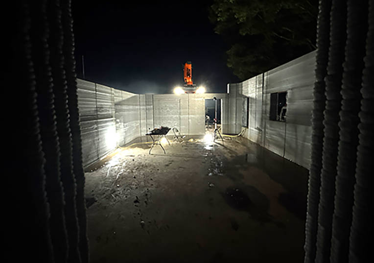 经过三年潜心研发,2025年6月27日,团队在SCC校园内启动了"FloodBuster 1"的实际打印工作。为确保基础稳固,团队提前数周完成了创新设计的混凝土基础板浇筑。尽管当时正值酷暑高温,团队仍成功完成了打印任务,整个结构打印耗时53小时。这一过程吸引了约300名现场观众和100多名在线观众的关注。