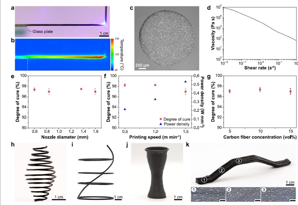 光学横截面显示圆形长丝的几何形状。d-g) 打印适性指标,包括不同工艺条件下的剪切稀化行为和固化程度。h-k)