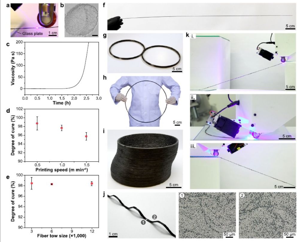 室温下树脂粘度的稳定性。d–e) 固化程度随速度和丝束尺寸的变化。f–i) 打印结构具有高刚度和最小空隙率。j–k)
