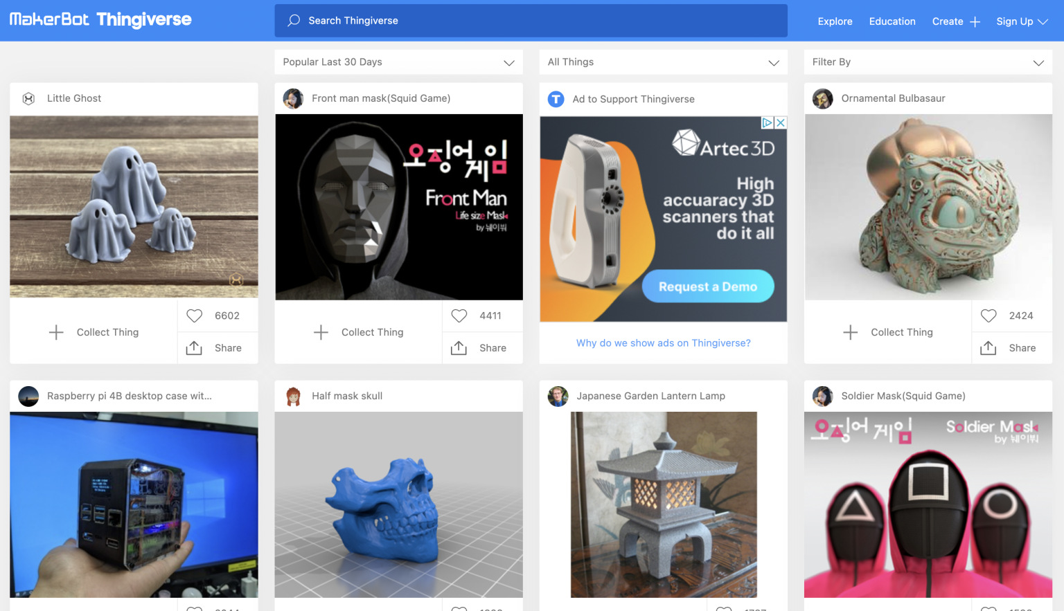 △从Thingiverse 主页中选择的 3D 可打印模型