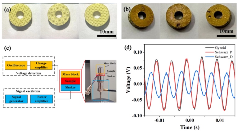 制造出了具有Gyroid、Schwarz_P、Schwarz_D结构的陶瓷件,素坯件、热解件与烧结件的孔隙清晰可见,无翘曲,裂纹等缺陷,如图1所示。进而灌注树脂形成了具有Gyroid、Schwarz_P、Schwarz_D陶瓷结构3-3型压电复合材料,在周期性载荷驱动下其输出电压可达80