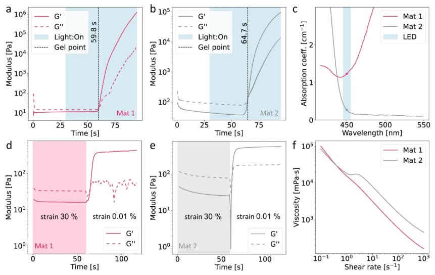 的恢复时间为1.7 秒,从而实现了精确的油墨沉积和稳定。紫外-可见光谱法证实,两种材料在 TVAM 设置中使用的 450 nm
