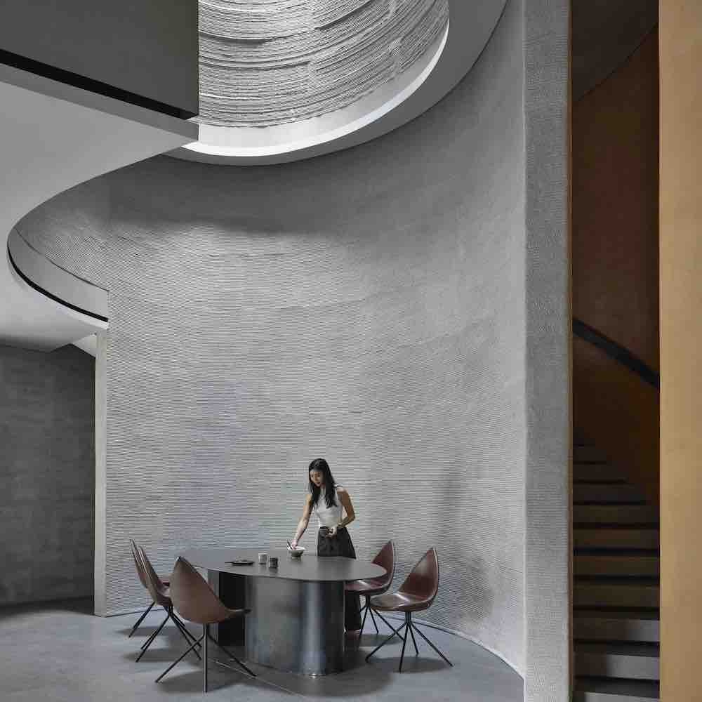 最终的建筑结构成功地实现了这些目标。这座独特的四层建筑,90%的结构由3D打印的混凝土材料制成。这座3D打印房屋最显著的特征包括:裸露的混凝土墙,将打印过程的分层效果巧妙地转化为具有纹理的设计元素;狭长的带状窗户,既提供照明,又具有隔热功能;以及一个从底层延伸到顶层的圆锥形空隙。这个设计元素不仅作为阳光房,将自然光引入室内,而且还能作为气候调节器,将暖空气向上引导。通过设计中巧妙融入的被动式涡轮抽风机,这些暖空气随后被排出。