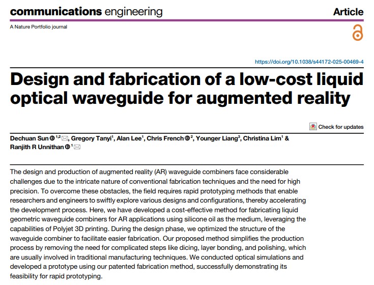 研究成果以题为“Design and fabrication of a low-cost liquid optical waveguide for augmented reality”的论文发表在《Springer Nature》期刊上。