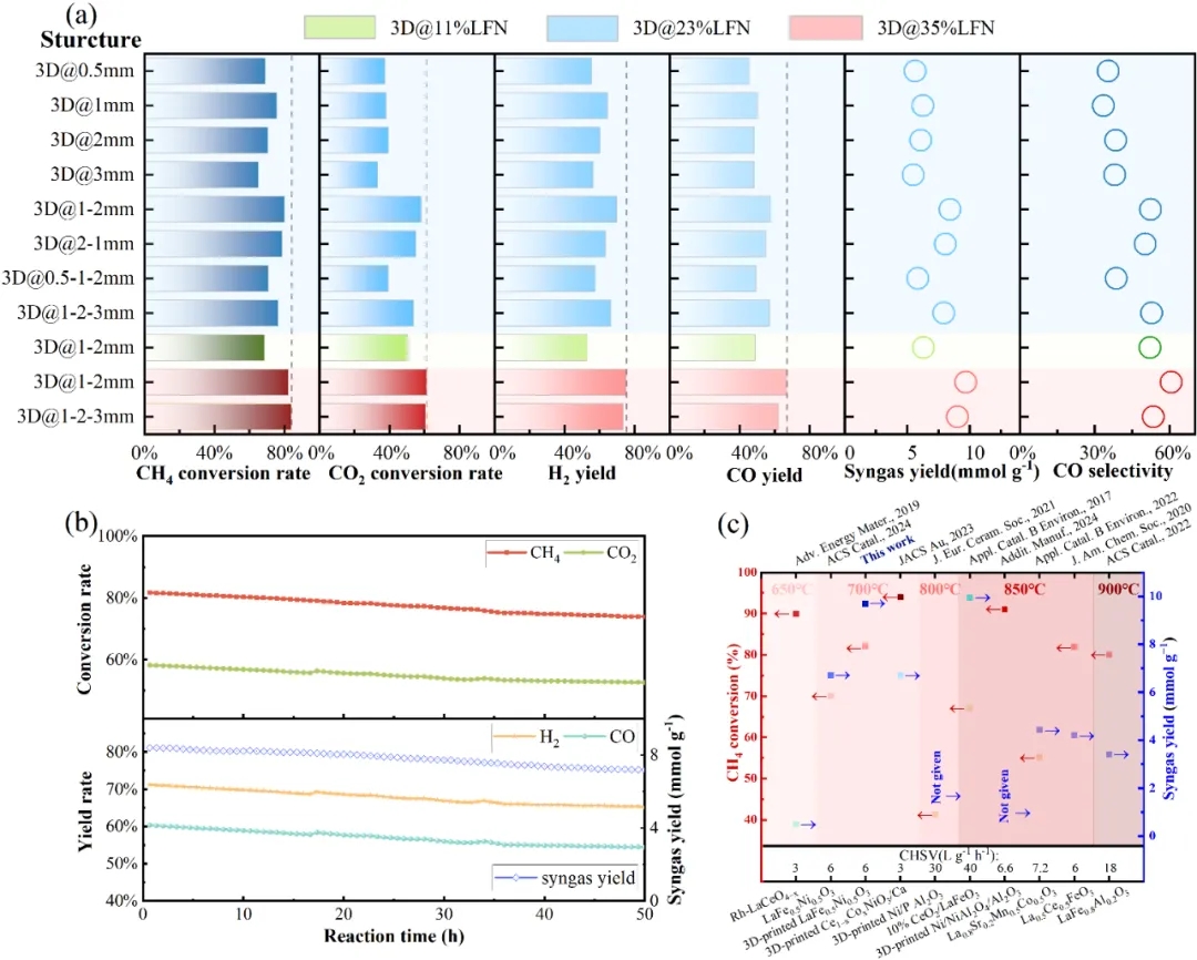 wt%的3D打印超结构催化剂显示出优异的催化性能:H2产率达69.83%,CO产率为57.83%,合成气产量为8.42