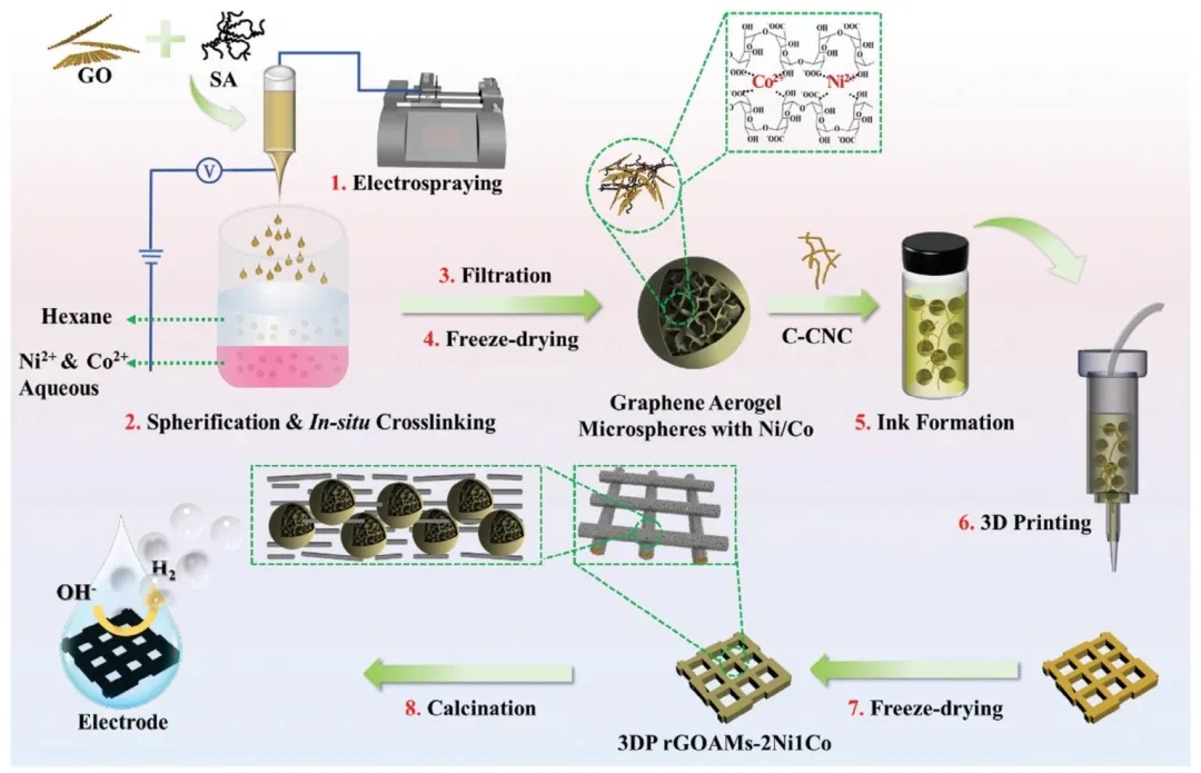 通过电喷雾、原位交联、冷冻干燥及热解等方法制备负载镍钴纳米颗粒的石墨烯气凝胶微球,再与羧化纤维素纳米晶体制成墨水后利用直接墨水书写技术3D打印,研究3D打印电极的制备工艺,结果表明成功构建出具有周期性晶格结构的电极,利于气泡释放和电解液渗透。