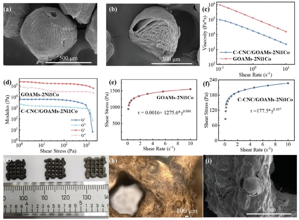 通过扫描电镜观察微球表面和内部结构,测试墨水的剪切粘度、储能模量和损耗模量,研究GOAMs-2Ni1Co微球的形貌及墨水的流变学特性,结果表明微球呈卷心菜状多孔结构、直径约500微米,添加羧化纤维素纳米晶体的墨水打印适性良好,挤出后能保持结构稳定。